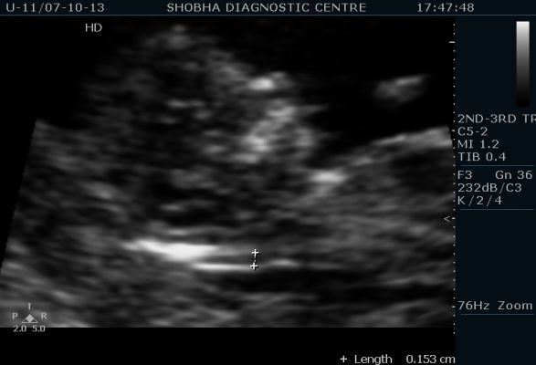 ULTRASOUND TEST: This is done at 11-13+6 weeks and is performed by FMF (Fetal Medicine Foundation) certified operator. All the three radiologists at shobha diagnostic centre are FMF certified. This involves evaluation of Nuchal Translucency (fluid behind baby’s neck) and other markers for chromosomal abnormality like nasal bone. These measurements are abnormal in Down’s syndrome. The overall fetal anatomy is also checked at this time.